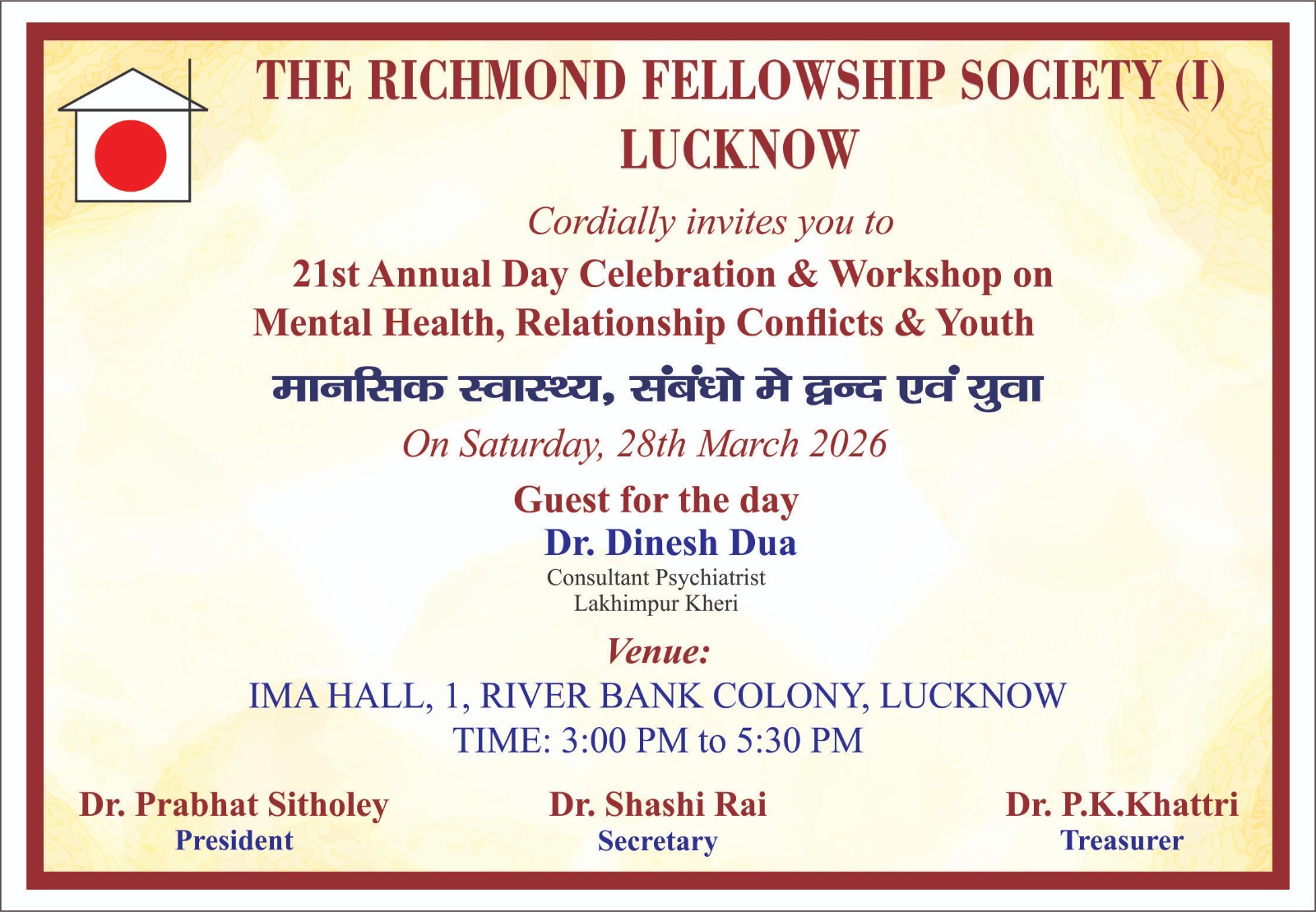 The centre run by The Richmond Fellowship Society (India) Lucknow is known by the name Nav Uday Mansik Swasthya Sansthan (नव उदय मानसिक स्वास्थ्य संस्थान) and is located at Viraj Khand 5, Gomtinagar, Lucknow - 226010, branch was started in March 2005 with the motivation of our patron Prof. G.N. Narayan Reddy, under the guidance of Prof. A.K. Agarwal and 12 founder members. The aim of the organization is to rehabilitate patients of chronic mental illness so that they can function in the community productively in spite of their illness