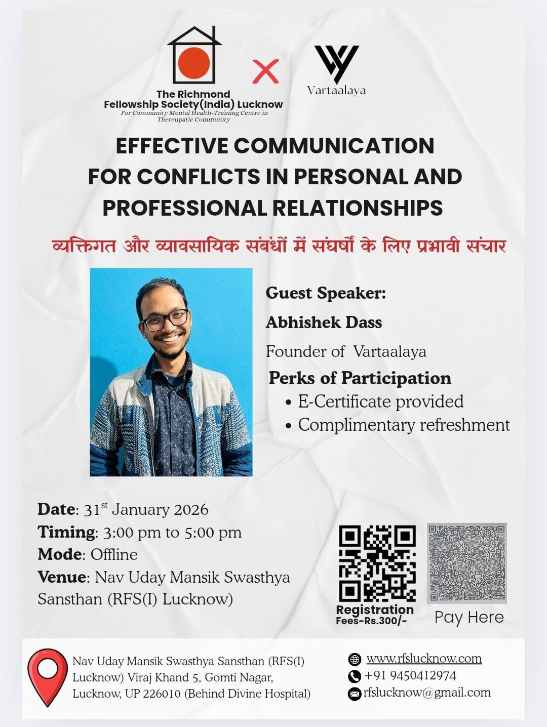 The centre run by The Richmond Fellowship Society (India) Lucknow is known by the name Nav Uday Mansik Swasthya Sansthan ((नव उदय मानसिक स्वास्थ्य संस्थान) ) and is located at Viraj Khand 5, Gomtinagar, Lucknow-226010
